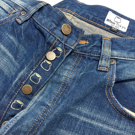 特殊なブリーチで色を落とすと同時にユーズド感を出し、ほんのりベージュで染めることで強みのあるインディゴ色になっています。