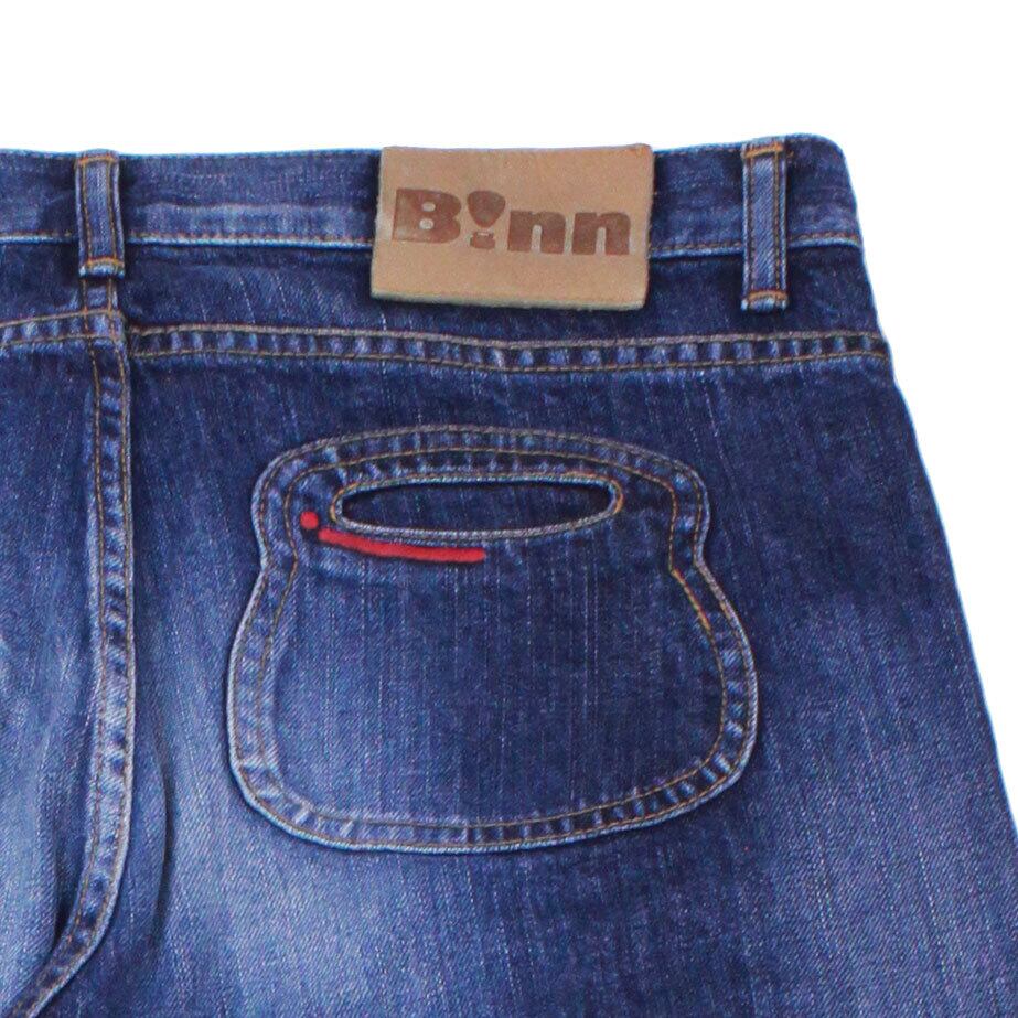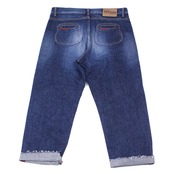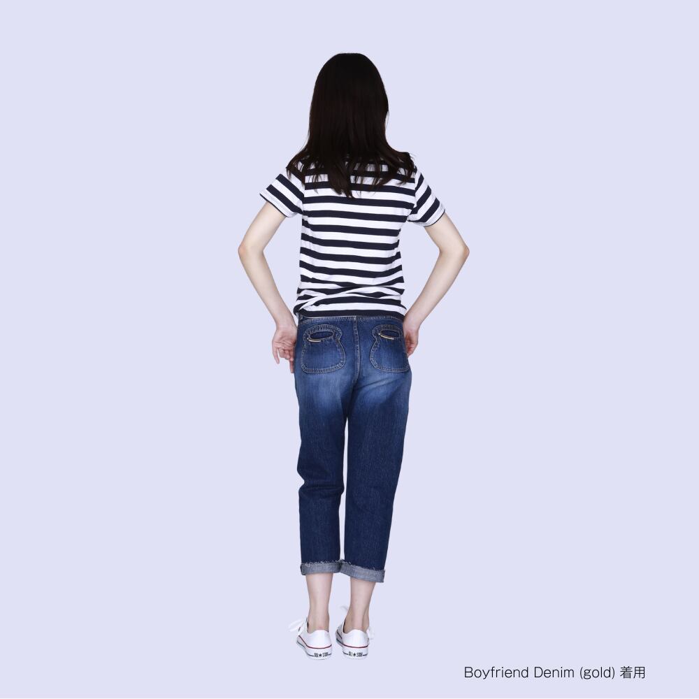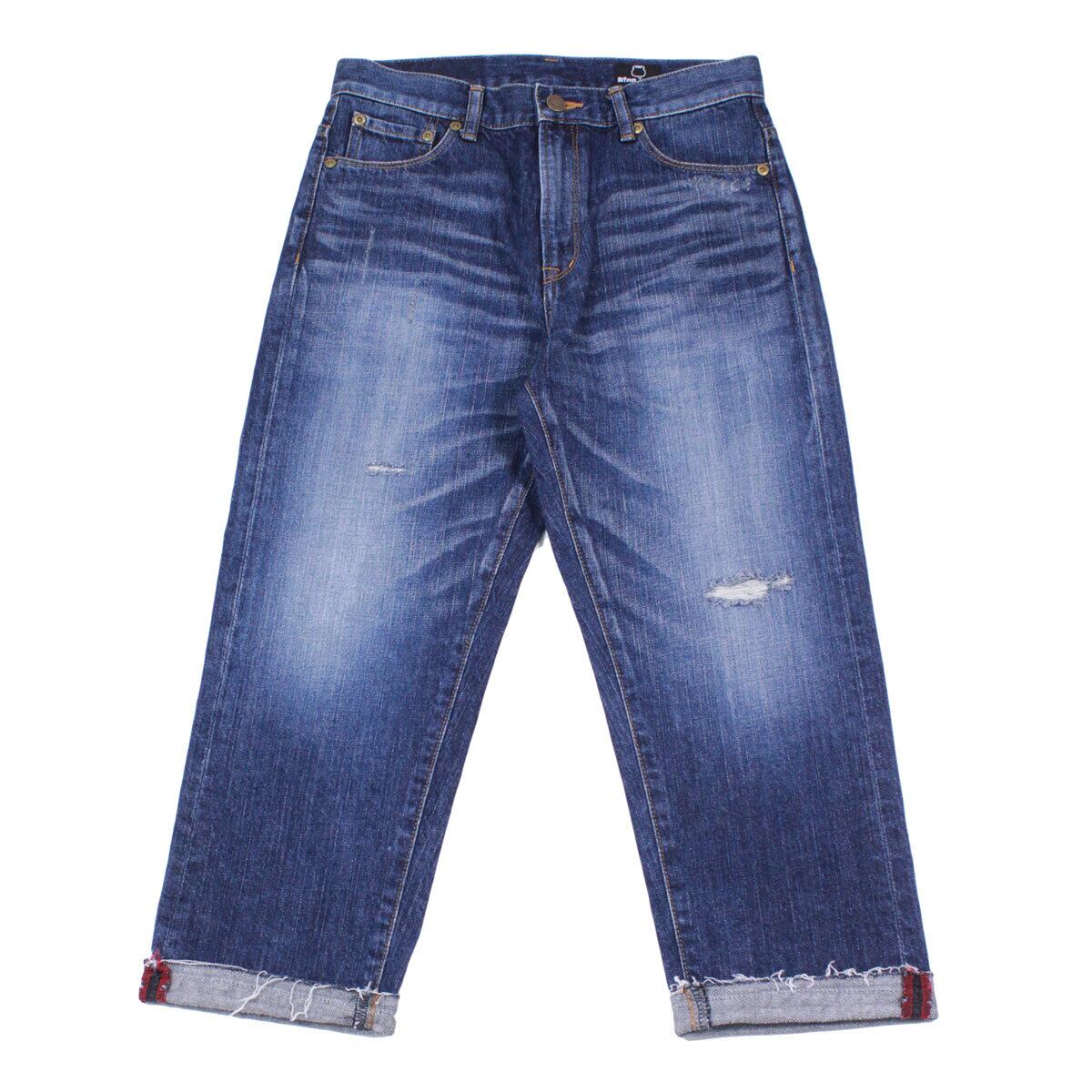 意図的に入れた細かい傷とバランスよく開けている穴がポイントです。 色落ち加減はビンテージのような風合いに仕上げました。 裾には、チェーンステッチをかけて擦れたアタリを出した後に一度解いてダメージ感を持たせ、back はシンプルながらも、手間をかけたシェービング加工を施してウエストや腿に立体感を出しました。